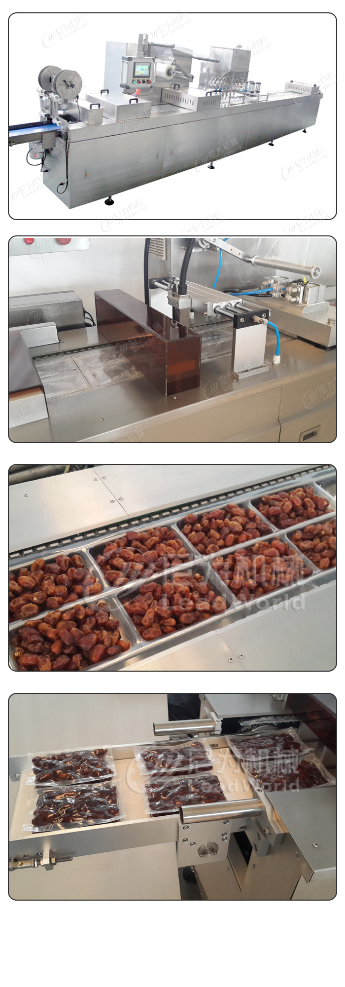椰棗拉伸膜真空包裝機(jī)可搭配多頭秤組合、灌裝機(jī)構(gòu)、壓平機(jī)構(gòu)、噴碼設(shè)備等。
